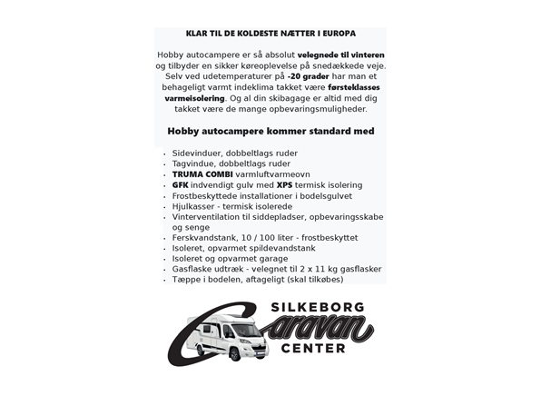 Standardudstyret omfatter bl.a Kraftig 140 HK Blue-HDI motor, PIONEER navigationssystem med Apple Carplay/Android Auto, DAB+ og bakkamera, 16" originale Citroën alufælge, manuelt klimaanlæg i bildelen, fartpilot, tagvindue i førerhuset, "captains chairs" drejbare, REMIS plissé gardiner i førerhus, GFK-glasfibertag for optimal haglbeskyttelse, 400 cm THULE markise, insektnet i indgangsdør, gasflaske udtræk med plads til 2 x 11 kg, forberedelse til solceller, sengeudvidelse med stige og koldskumshynde, opvarmet og isoleret spildevandstank 96L, TRUMA Combi 6 varmer med 10L varmtvandsbeholder, HOBBY CONNECT styresystem med bluetooth.
