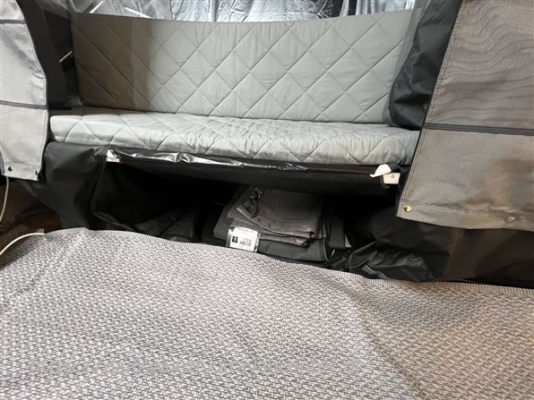 Teltvognen er fyldt med udstyr: Køkken Deluxe, Solsejl, Solsejl front, Køkken solsejl, Lamelbund til bunden, Topmadras til bunden & Tæppe Flint 3,0 x 4.0m 2 stk.