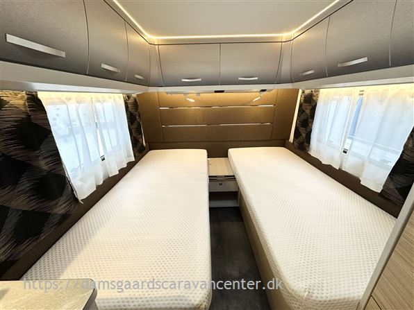 Vognen er indrettet med brede enkeltsenge med lameludtræk i bagenden.