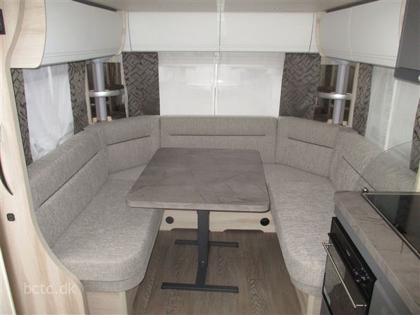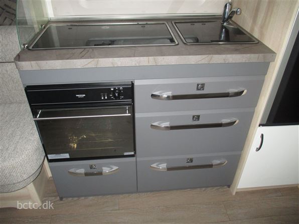 Stort køleskab og meget mere. Denne vogn er specialbygget på Hobby med: Faconsyet tæppe, Hobby Connect TFT/Bluetooth, Gulvvarme, gasbageovn, multistik, gasudtag, emhætte, ekstra USB-stik, stor garage-dør (lasteluge), 15" alu-fælge samt forstærket aksel til 2000 kg.
